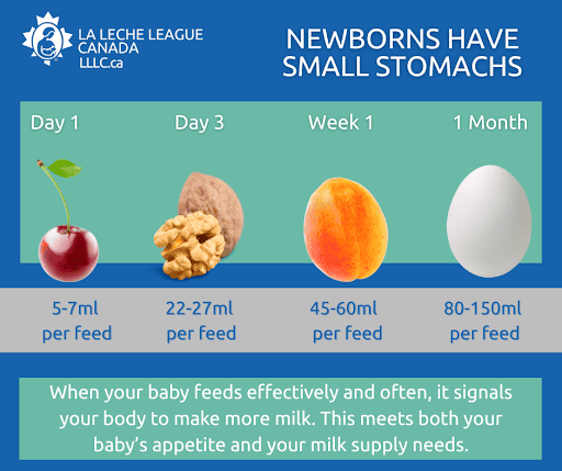 Yes, yes and yes, 100% so. At birth, the infant’s mouth takes over from the umbilical cord that was the constant source of nutrition and oxygen. The mouth becomes the avenue to feed the newborn now outside the uterus. The size of a newborn’s stomach, at birth, has a capacity to hold between 3-7 ml of colostrum (the first breast milk) at each feed. In fact, the colostrum has been found to smell and taste like amniotic fluid. The recognizable smell and taste for the baby outside the womb must be comforting, and is designed to be their first food. Babies practice swallowing in utero. The newborn stomach stretches gradually over the next week to a capacity of 1.5 to 2 ounces, up to about 60 mL, then more over the first month reaching a capacity of 80-150 mL or 3-5 ounces. The stretching of the newborn’s stomach coincides with the mother’s milk “coming in” and volume of milk increasing over the first week, and increased volumes with age.